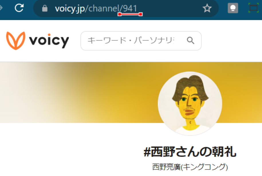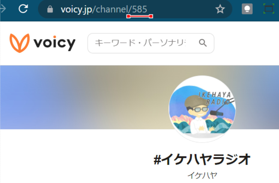 VoicyのURLをWebブラウザから確認すると、チャンネルごとに”チャンネルID“が割り振られているようでした。